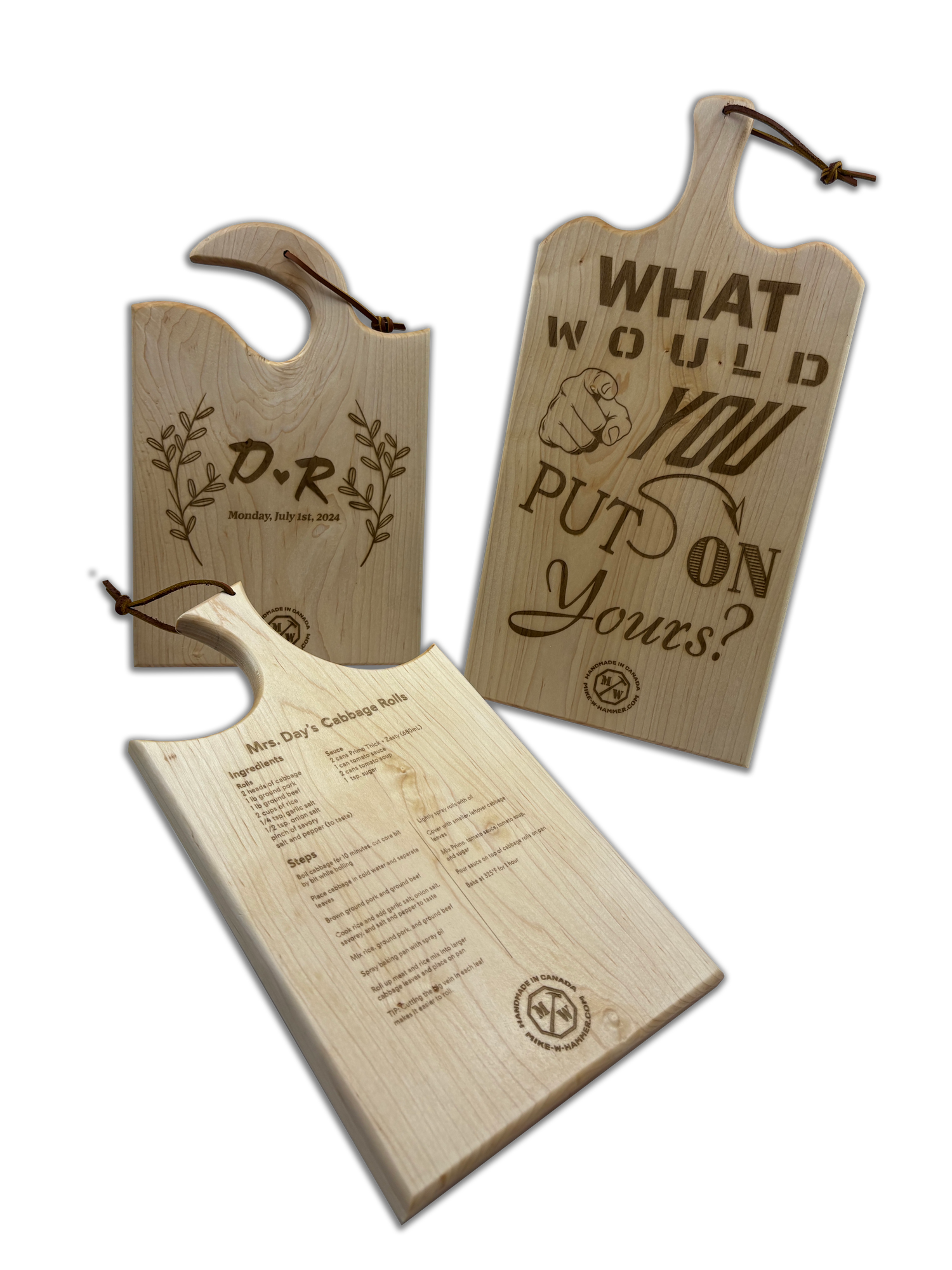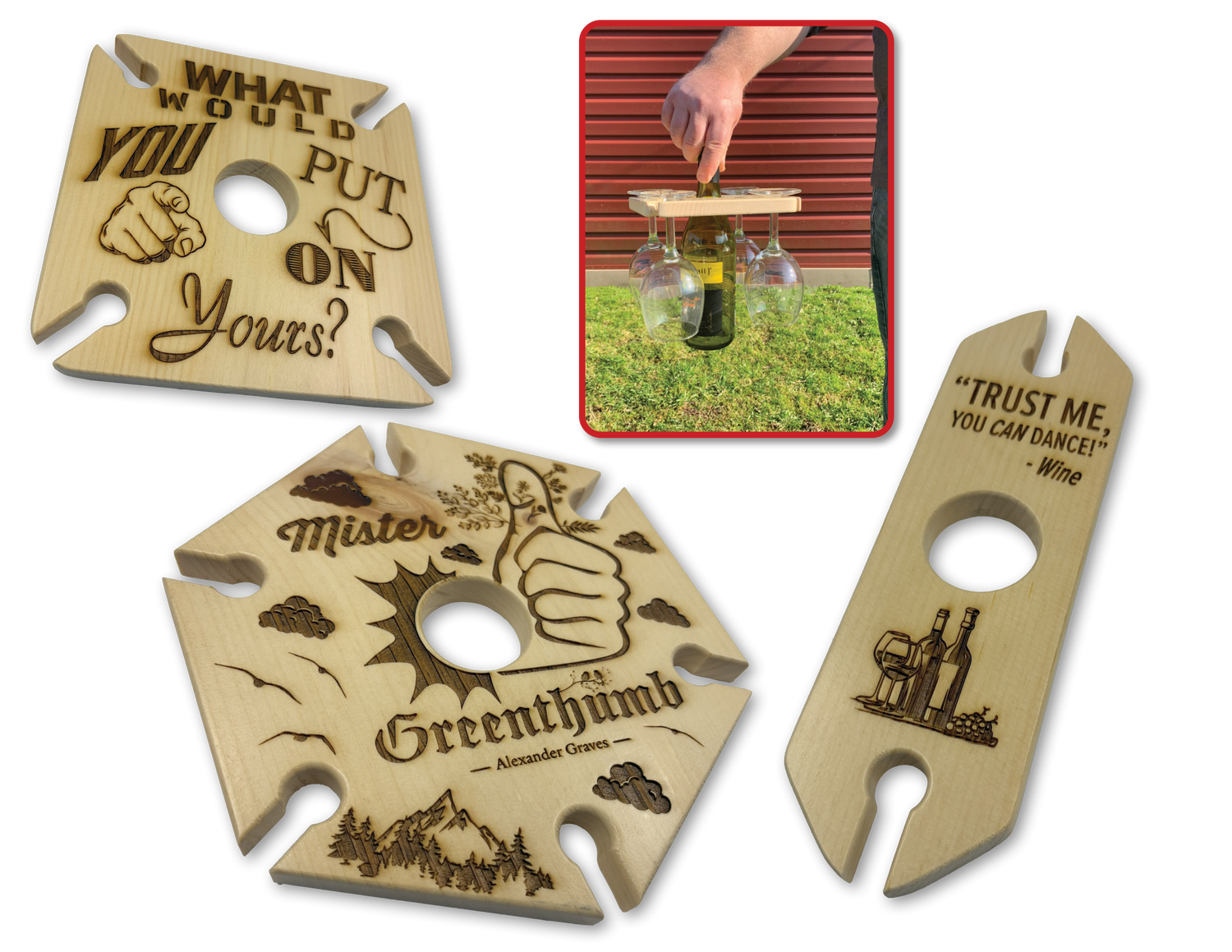 Our wall art, wine caddies, and hanging trays cover most occasions – but occasionally someone needs something special we don't offer. A custom wooden piece for their business. A specific-sized serving board. An engraved keepsake box. If Mike's workshop can handle it and timing allows, we might take on custom product builds. Fair warning: it depends on complexity, our current schedule, and whether Mike says "yeah, I can do that."